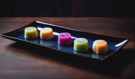 A beautiful arrangement of colorful Japanese sweets on a wooden tray, paired with a cup of tea. This image captures the essence of tradition and culinary artistry.