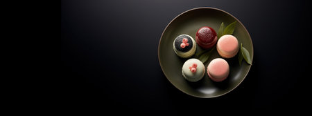 Generative AI, mochi on the dark table background, Traditional Japanese dessert, top view, flat lay