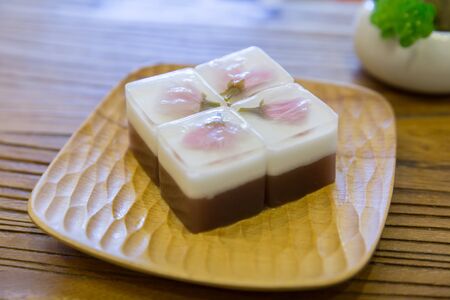 A piece of delicious Japanese confectionery on off white ceramic plate on wooden table. Selective focus.