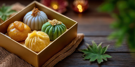 Traditional colorful Chinese sweets in deluxe gift box with autumn leaf on wooden table creating warm festive mood