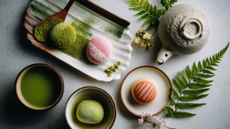 Experience the tranquility of a traditional Japanese tea ceremony featuring delicate sweets, green matcha, and natural decorations.