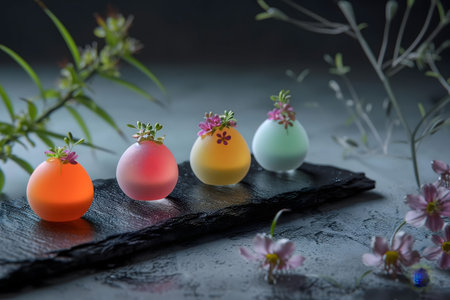 Glowing egg-shaped desserts decorated with delicate flowers. A stylish culinary art presentation.