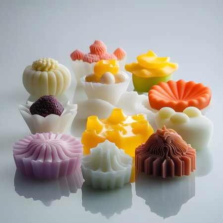 A beautiful assortment of traditional Asian jelly desserts, showcasing vibrant colors and intricate designs, perfect for culinary presentations and celebrations.