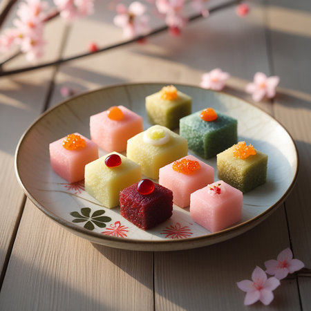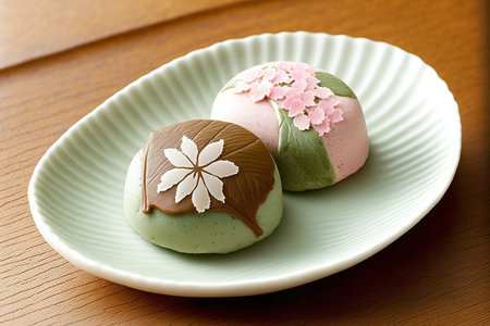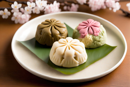 Japanese spring sweets in soft sunlight, seasonal traditional desserts background, AI generated
