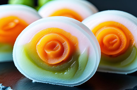 Delicious cold Japanese mochi dessert with colorful rice dough shell and fruit filling on dark background