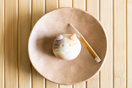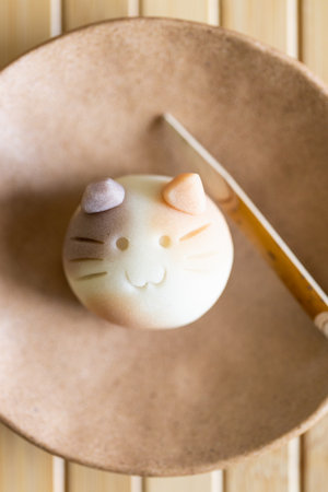 Traditional Japanese confectionery, Wagashi, in shape of smiling cat. A piece of delicious Japanese confectionery on ceramic plate on wooden table. Selective focus.