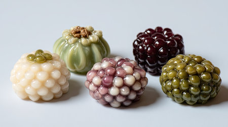 A collection of Japanese wagashi, each piece a unique work of art, set against a white background, perfect for showcasing the beauty of Japanese desserts.