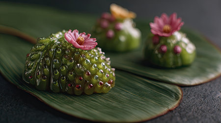 A stunning arrangement of artistic desserts featuring green textures and delicate flowers, elegantly placed on fresh leaves to enhance visual appeal.