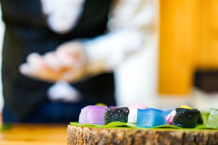 Japanese confectionery wagashi on table. Traditional rice dessert. Vegan sweets. Copyspace.