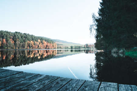 Autumn landscape with forest lake at sunny calm fall morning