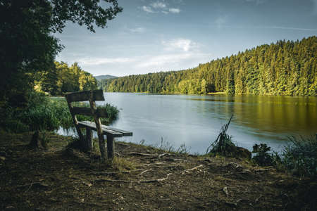 Bench in front of a lake with clouds on the sky and trees behind in the bavarian forest