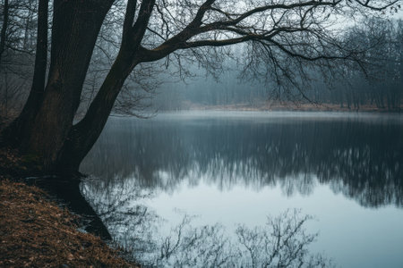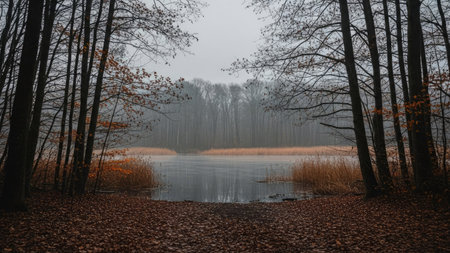 An evocative scene presents a lake surrounded by bare trees under a hazy sky. The foreground is filled with fallen leaves, while the water reflects the muted tones of the environment. The overall composition suggests a tranquil, natural setting suitable for various editorial and commercial applications.
