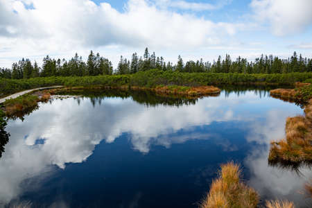 Clouds reflecting in dark swamp water of Lovrenska lakes, Rogla, Slovenia