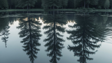 AI Generated. Tranquil Reflection of Evergreen Trees in Dark Pond Water Surface
