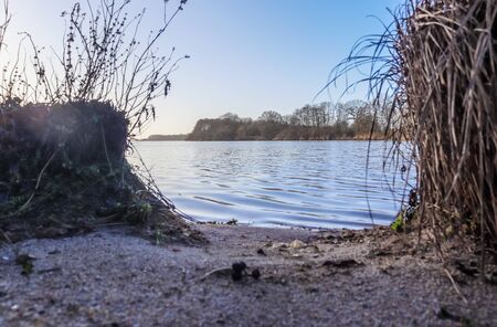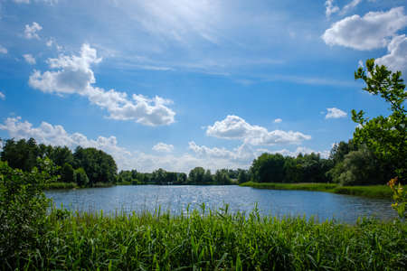 Beautiful landscape of a lake with reeds and blue sky.