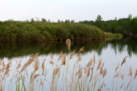 Calm and quiet spring landscape. Dry reeds on the lake shore.