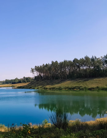 Landscape and nature with calm water of big lake, trees on the shore and blue sky on autumn or spring sunny day. Sun and good weather over the water of river or backwater in early spring or autumn