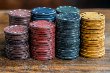 colorful chips on a wooden table in a game of Texas Hold'em Poker