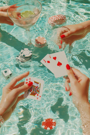 Hands are seen playing cards in a sparkling pool, surrounded by colorful chips and refreshing drinks, creating a lively atmosphere.