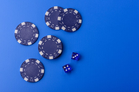 Casino dice and chips on a colored background, poker, gambling with bets. Dice and chips as a background for your design