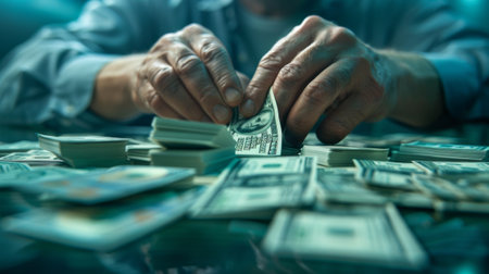 Neatly folded stacks of hundred dollar bills on a black background in front of a man. Close-up. On his sides are beautiful stacks of dollars in bundles. Big money concept.