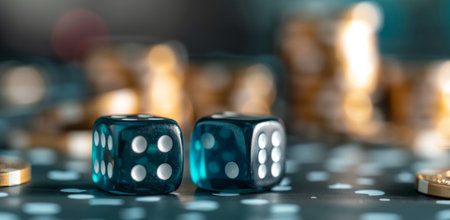 Two blue dice with white dots lay on a blue table. There are other blurry dice and coins in the background.