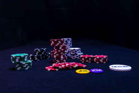 Poker chips colorful gaming pieces lie on the game table in the stack. Background for gambling, casino, business, poker. Colorful casino chips for casino game on the table. soft focus