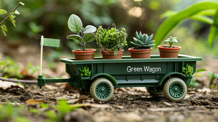 Miniature green wagon with succulent plants in pots. Gardening concept.