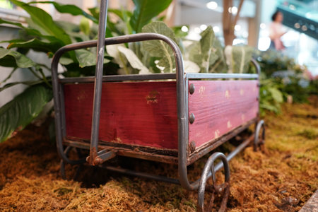Old miniature wooden trolley with plants in the greenhouse