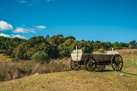 Ancient wood wagon on hill top with dry bushes and trees amid rural lowlands called Pampas near Cambara do Sul. A small country town in southern Brazil with amazing natural tourist attractions.