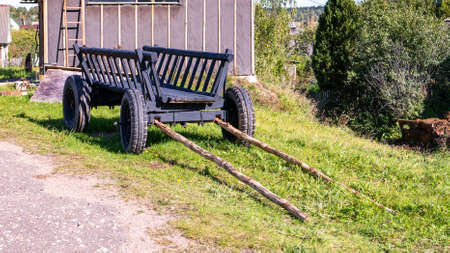 Old village wooden cart to transport grass and wheat. Horse saddle. Village atmosphere