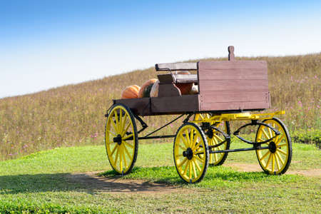 An old wooden wagon laden with pumpkins rests on a grassy field. The scene features warm tones and natural light, creating a rustic ambiance. A shallow depth of field adds emphasis to the wagon and pumpkins. This image may be used for seasonal promotions, agricultural themes or general design.