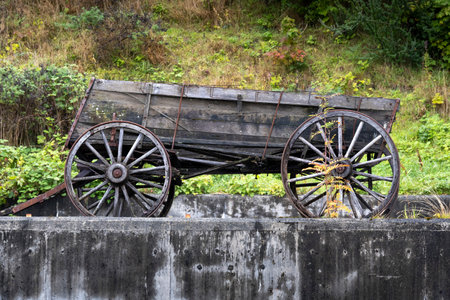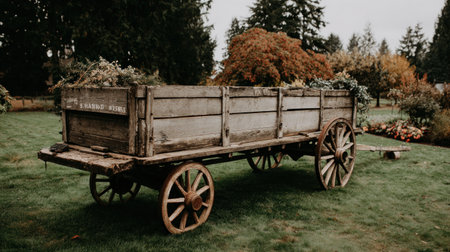 An antique wooden wagon sits stationary on a bed of green grass. The wagon features large wooden wheels and a weathered appearance, suggestive of age. The scene is bathed in natural light, with a blurred background of trees, indicating an outdoor daytime setting. Ideal for various commercial applications including historical, agricultural, or rural themed projects.