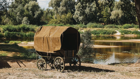 Old carriage standing near the lake