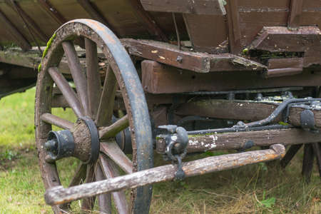 The wooden wheel of a cart standing in the grass. An old horse-drawn carriage. An old abandoned unnecessary cart.