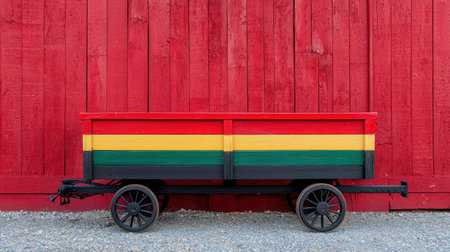 This image features a colorful wooden cart with vibrant stripes set against a striking red barn wall, perfect for rustic or rural themed projects.
