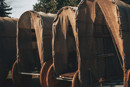 The photo shows several wooden carts with canvas roofs, resembling nomadic wagons or transport from past centuries, standing outdoors.