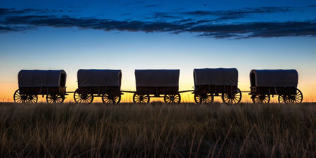 Five covered wagons stand in silhouette against a vibrant sunset sky, evoking an adventurous spirit.