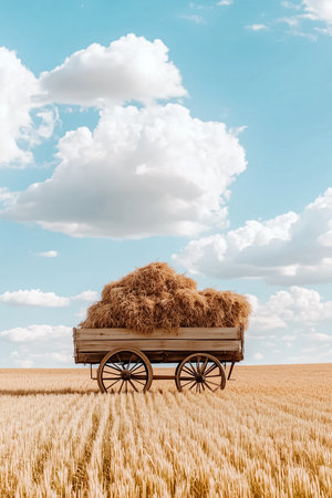 Flax stalks are neatly arranged on a wooden wagon, resting in a harvested field. Soft clouds drift across the vibrant blue sky, creating a peaceful atmosphere and highlighting the rural landscape.