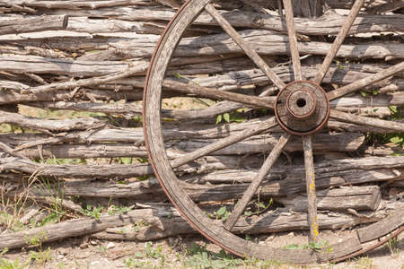 old wagon wheel on the wooden fence