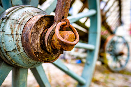 Old cart with big wooden wheels close-up, selective focus