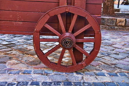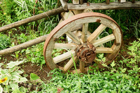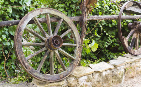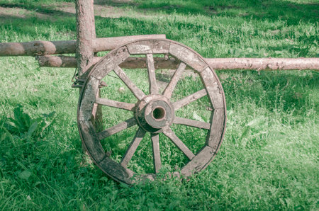 Old wooden wheels from the cart. Retro, country life. The first way to travel