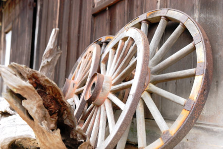 Detail Of Wooden Wagon Wheel, Cartwheels close up from the center, Forgotten old Wooden Wagon Wheel Leaning Against a Wooden Wall. Cartwheels at the old wood wall.