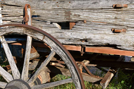Hub, rim, box, and spokes of an old wheel supporting a rotting weathered wood wagon