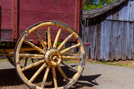 A wooden wagon wheel of an old fashioned Conestoga wagon; at the Amish Farm and House in Lancaster, Pennsylvania