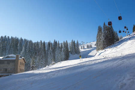 Mesmerizing funicular road located in a picturesque place among mountains and snowy hills and on frosty winter evening on blue sky. Concept of winter tourism in European countries. Advertising space