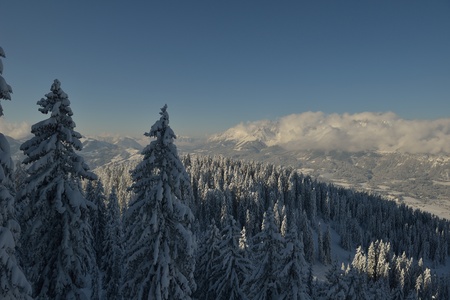 Trees covered by fresh snow in Austria Alps from Kitzbuehel ski resort - one of the best ski resort in the workd with 54 cable cars, 170 km prepared skiing slopes and place of famous hahnenkamm races.