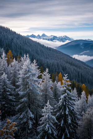 Aerial view of winter landscape with mountain hills covered with evergreen pine forest after heavy snowfall on cold quiet evening.