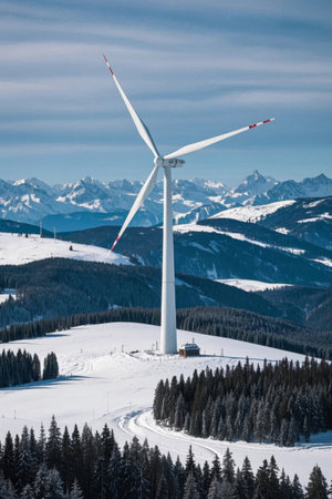 A snow-covered landscape showcases mountains and trees under a clear blue sky. The image displays a winter environment, possibly during the daytime, with sunlight illuminating the scene. This picture could be suitable for various commercial or editorial applications such as travel, nature, or seasonal themes.