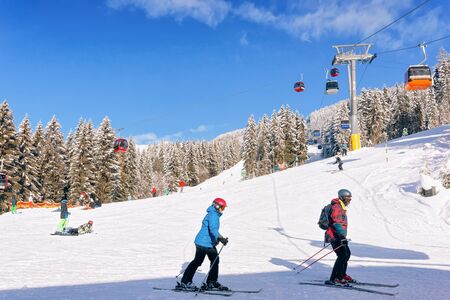 People Skiers skiing at Zillertal Arena ski resort in Tyrol in Mayrhofen in Austria in winter Alps. Ski in Alpine mountains with white snow and blue sky. Cable cars in Austrian snowy slopes.